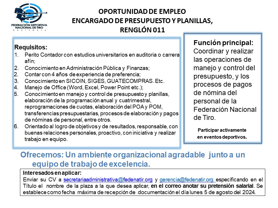 OPORTUNIDAD DE EMPLEO ENCARGADO DE PRESUPUESTO Y PLANILLAS, RENGLÓN 011
